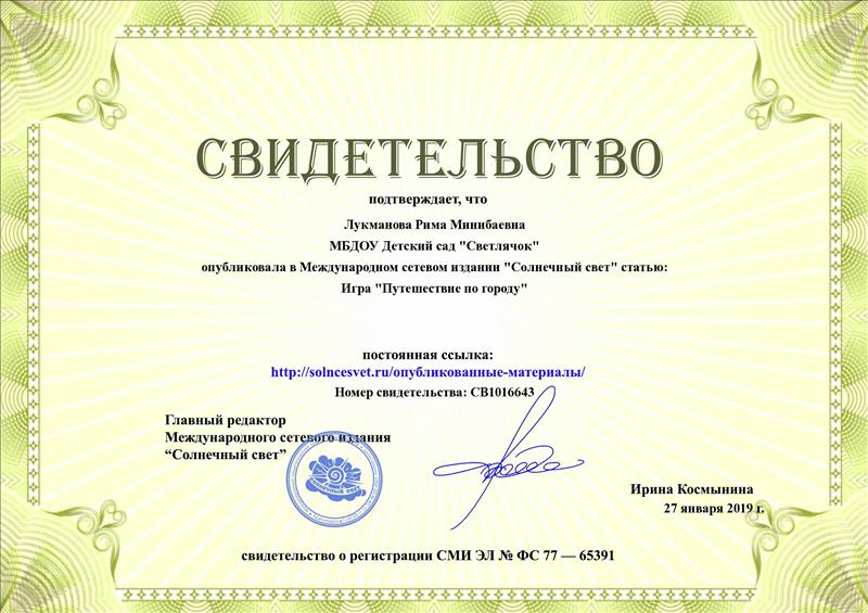 Свидетельство о публикации "Организация взаимодействия ДОУ и семьи воспитании безопасного поведения на улице"